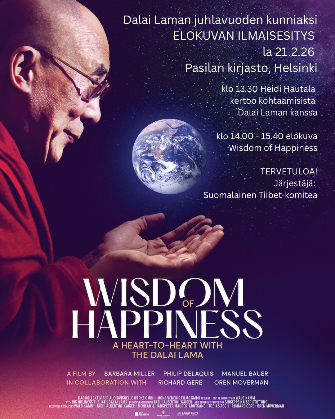 Tapahtuma Helsingissä alkaa 13.30. Alkusanojen jälkeen Suomen pitkäaikaisen MEP Heidi Hautala muistelee kohtaamisiaan Dalai Laman kanssa. Elokuvan esitys 14.00 - 15.40 välillä.